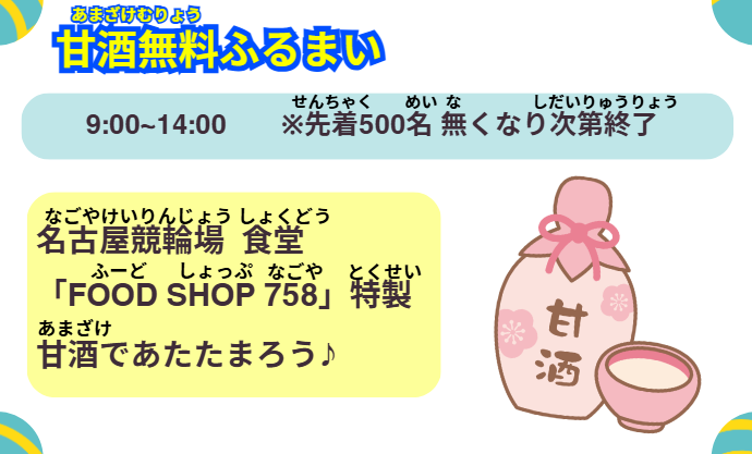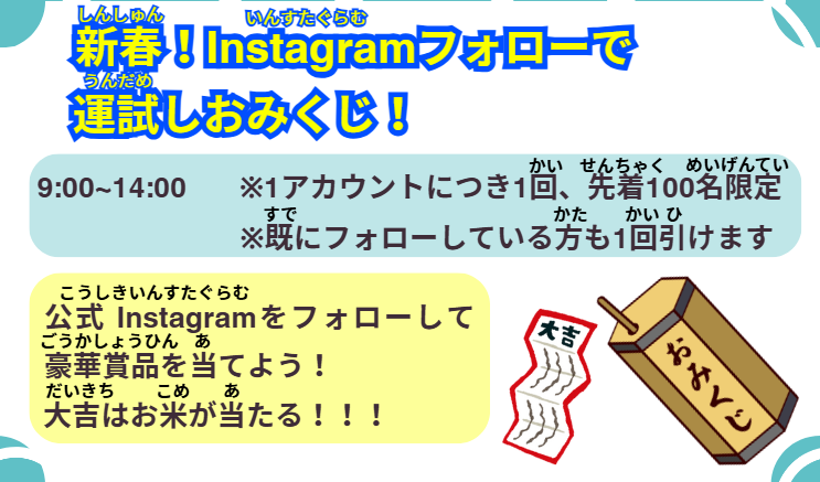 場内では先着500名様に甘酒を無料ふるまい、さらに”新春!運試しおみくじ”などお正月らしい企画も盛りだくさん!