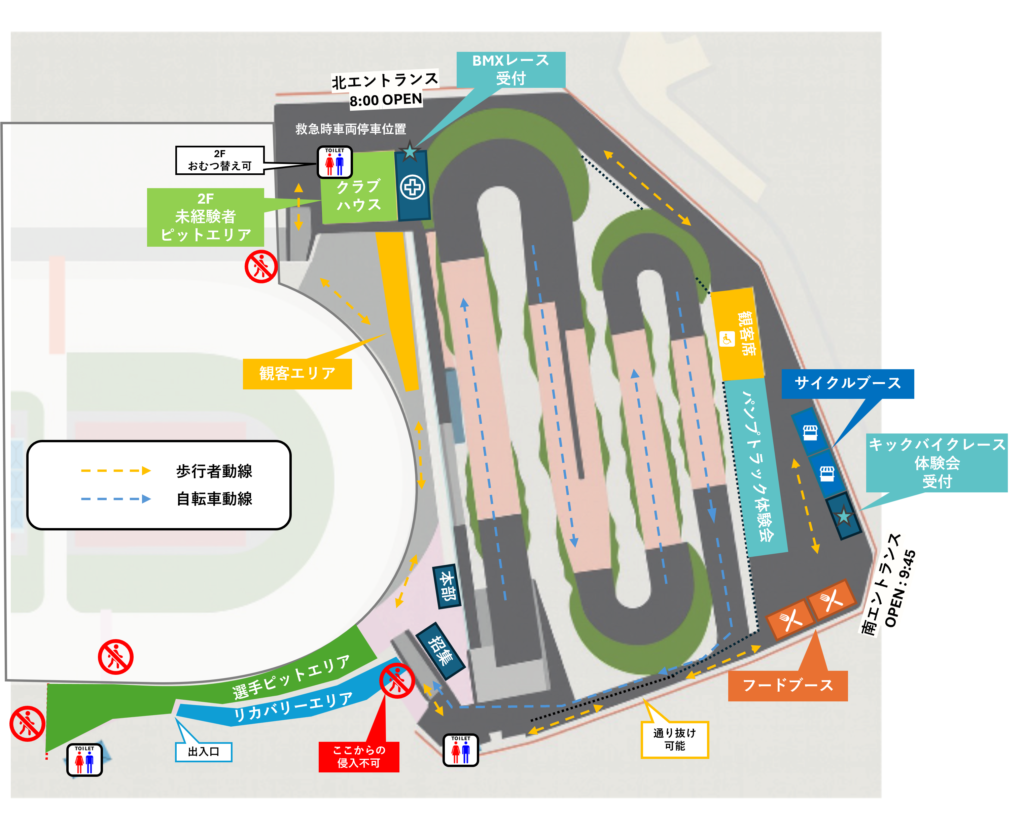 〇施設内ではレースコース及び走行可能なエリア以外では自転車を押して通行ください。